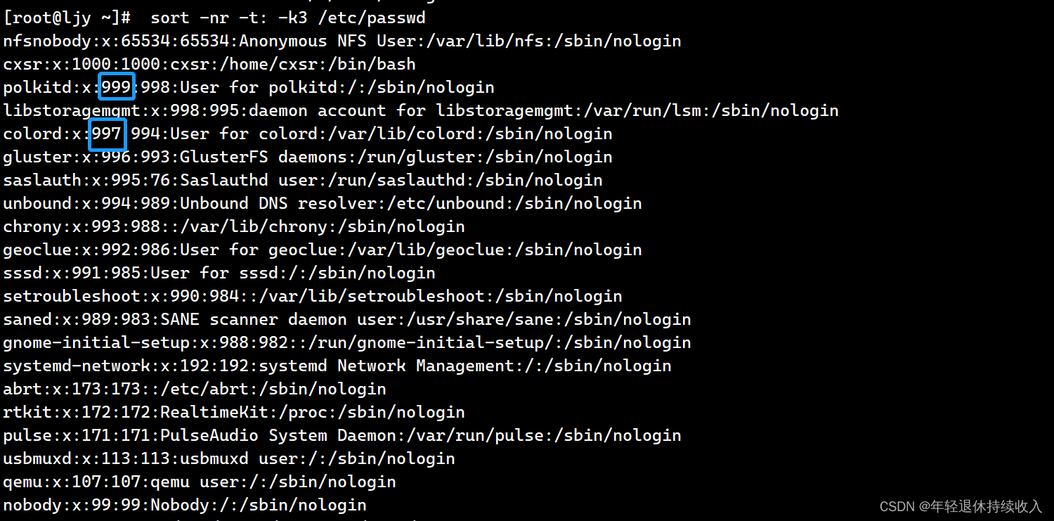 [root@ljy~]# sort -nr -t: -k3 /etc/passwd ##以冒号为分隔符,以数字大小对第三列排序(降序)