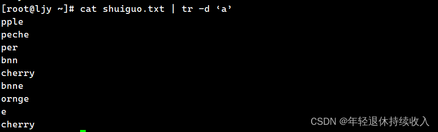 [root@ljy~]# cat shuiguo.txt | tr -d ‘a’ ##删除a