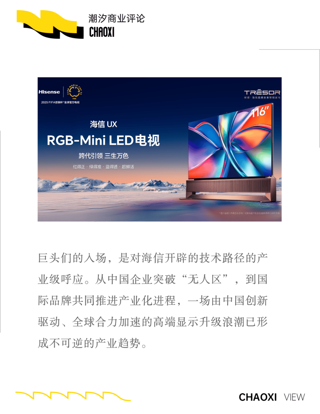 此次巨头们的入场,是对海信开辟的技术路径的产业级呼应。从中国企业突破“无人区”,到国际品牌共同推进产业化进程,一场由中国创新驱动、全球合力加速的高端显示升级浪潮已形成不可逆的产业趋势。