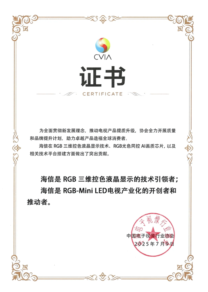 今年1月的CES展上,海信全球首发RGB三维控色液晶显示技术,并推出全球首台也是最大的116英寸RGB-Mini LED电视(该产品如今已量产上市);近日,海信凭借其全球首款量产RGB-Mini LED电视UX及突破性的“光色同控”核心技术,斩获中国电子视像行业协会“RGB-Mini LED显示技术引领者与产业开创者”的权威认证。