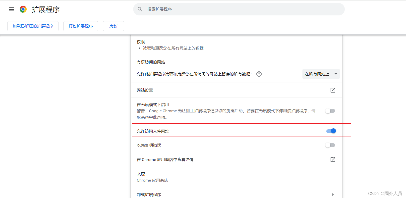 然后点击插件的详情,找到允许访问文件网址,勾选就可以了