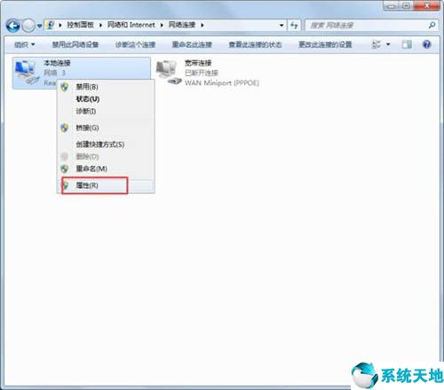 2、点击“更改适配器设置”右键点击“本地连接”打开“属性”;如图所示: