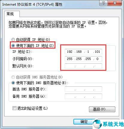 注:地址192.168.1.101 前面七位是根据路由器LAN的IP地址所来,若不相同便上不了网,后面三位不能与同一局域网的其他电脑IP地址相同,不然也上不了网。