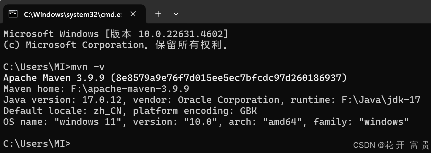 在命令窗口输入命令mvn -v检查Maven是否安装成功: