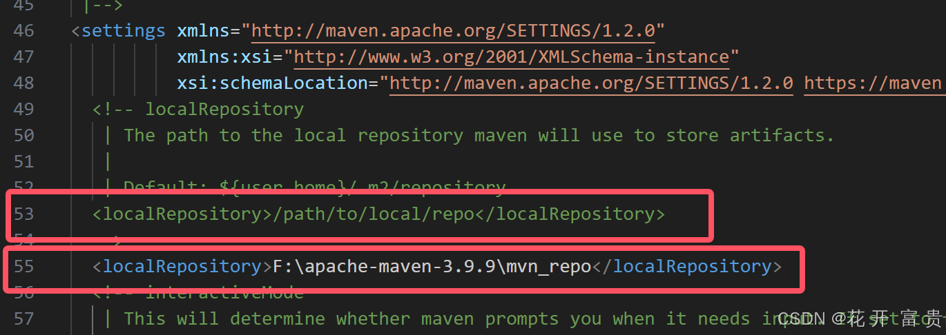 复制第53行代码<localRepository>/path/to/local/repo</localRepository>到下方,并修改路径为mvn_repo文件夹的路径
