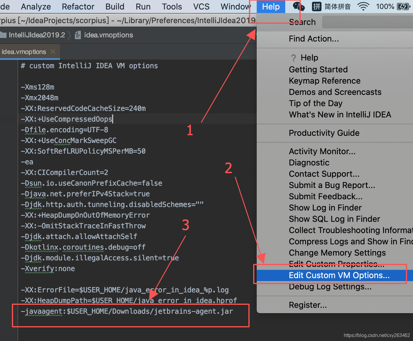 2、打开idea,选择help->Edit Custom VM Options... 在最下面加上一行代码: