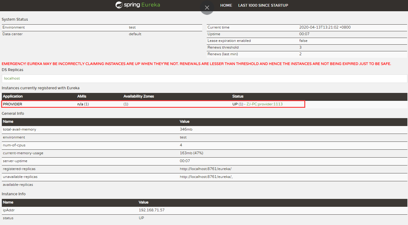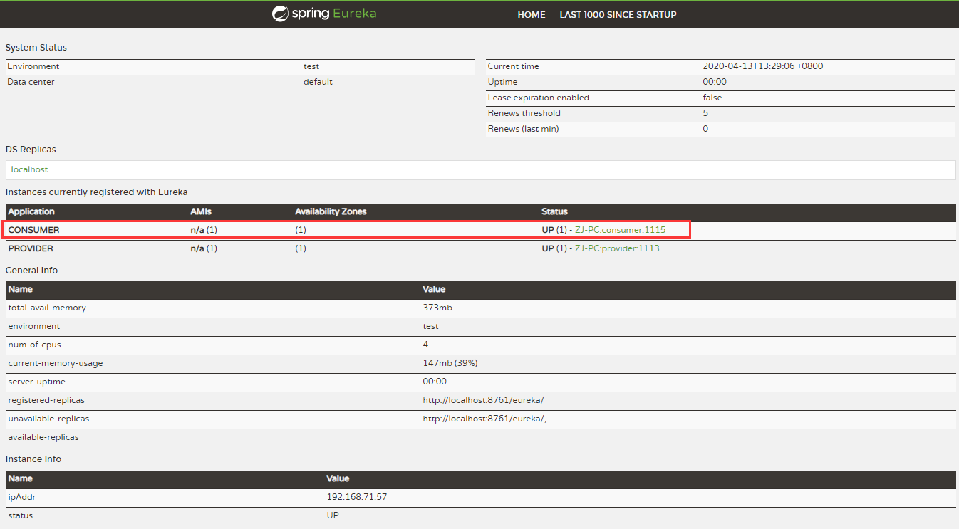 启动完成后,检查 Eureka Server 上,这两个 provider 是否成功注册上来。注册成功后,在 consumer 中再去调用 provider ,这样 DiscoveryClient 集合中,获取到的就不是一个实例了,而是两个实例,可以做客户端负载均衡。