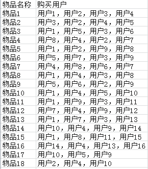 使用Python扩展库openpyxl读取Excell文件中的数据,返回一个字典。在字典中,使用用户名字作为“键“,使用包含该用户购买物品名称的集合作为”值“。读取数据时,跳过表头,对于每一行有效数据,获取每一行的物品名称和用户清单,对该物品的购买用户进行分割得到用户列表,列表中的每个用户都购买过该行对应的物品。