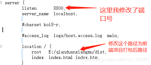 1)打开conf/nginx.conf文件,修改root 为前端项目打包后的目录,保存
