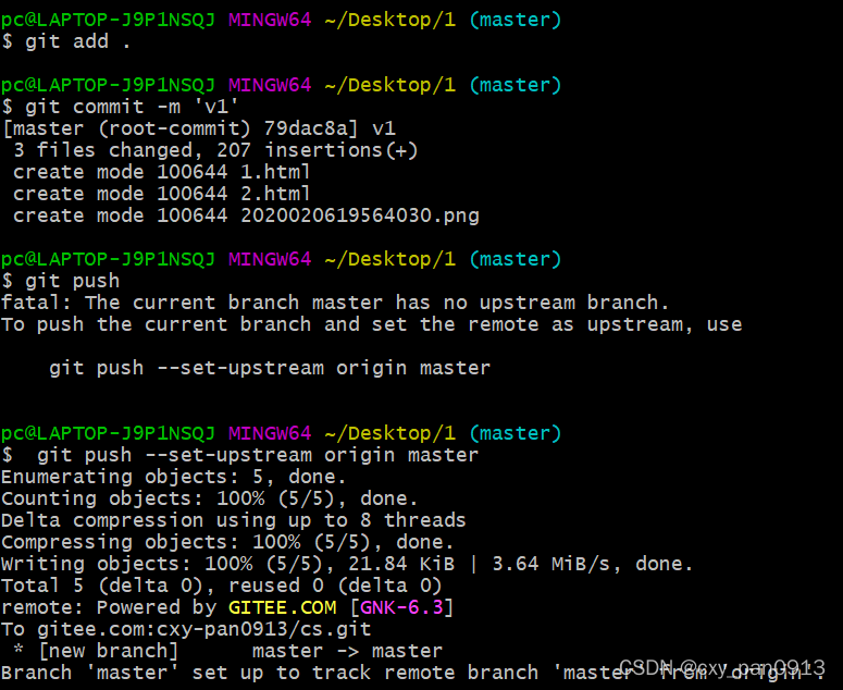 4、修改文件后依次操作,git add . ----- git commit -m '版本记录' ----- git push(首次push会报错,执行这个git push --set-upstream origin master)