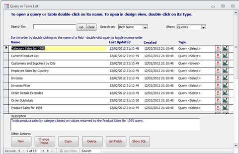 查询/表可以在设计视图中打开,运行,重命名,复制或从表单本身删除。 为了帮助维护,可以将查询或表的字段及其类型导出到Word,并且可以将Access所提供的基础SQL的格式化版本导出到查询SQL。