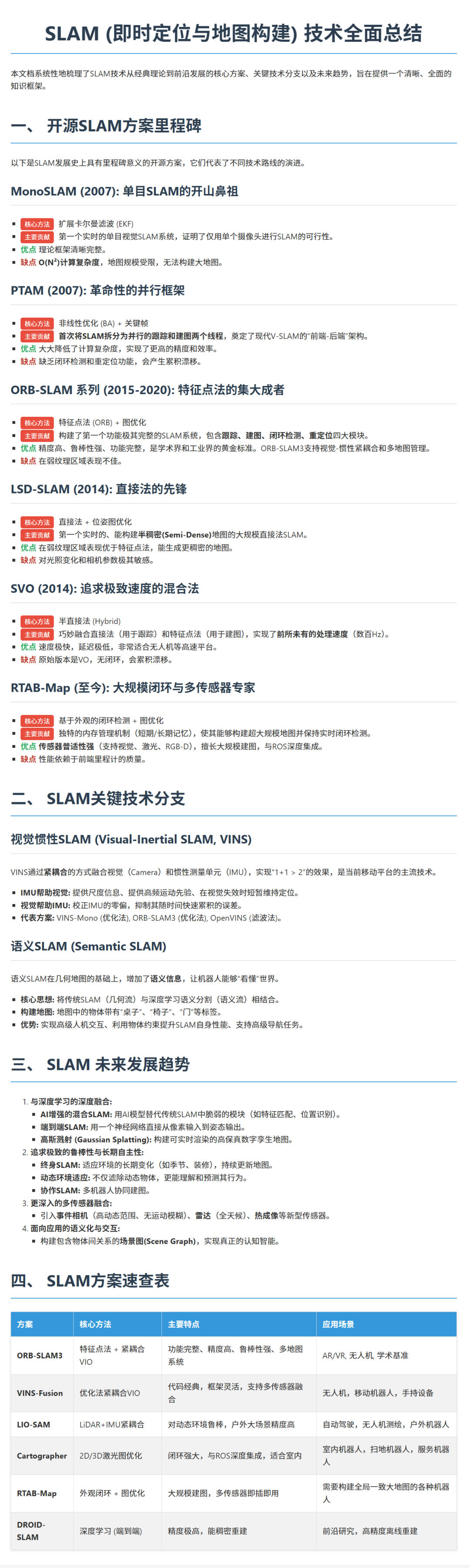 以下是当前主流和有影响力的开源SLAM方案的详细梳理: