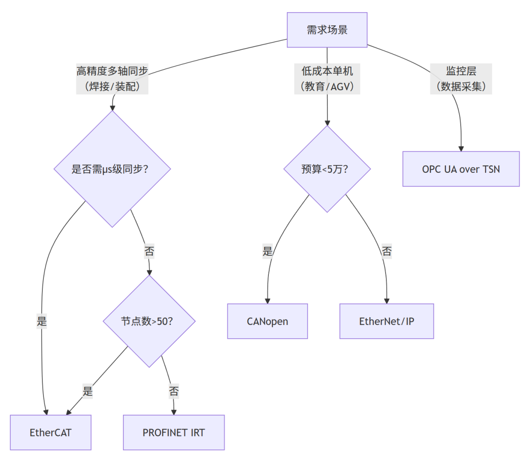 → EtherCAT(μs级同步+高带宽),适用于高端工业机器人