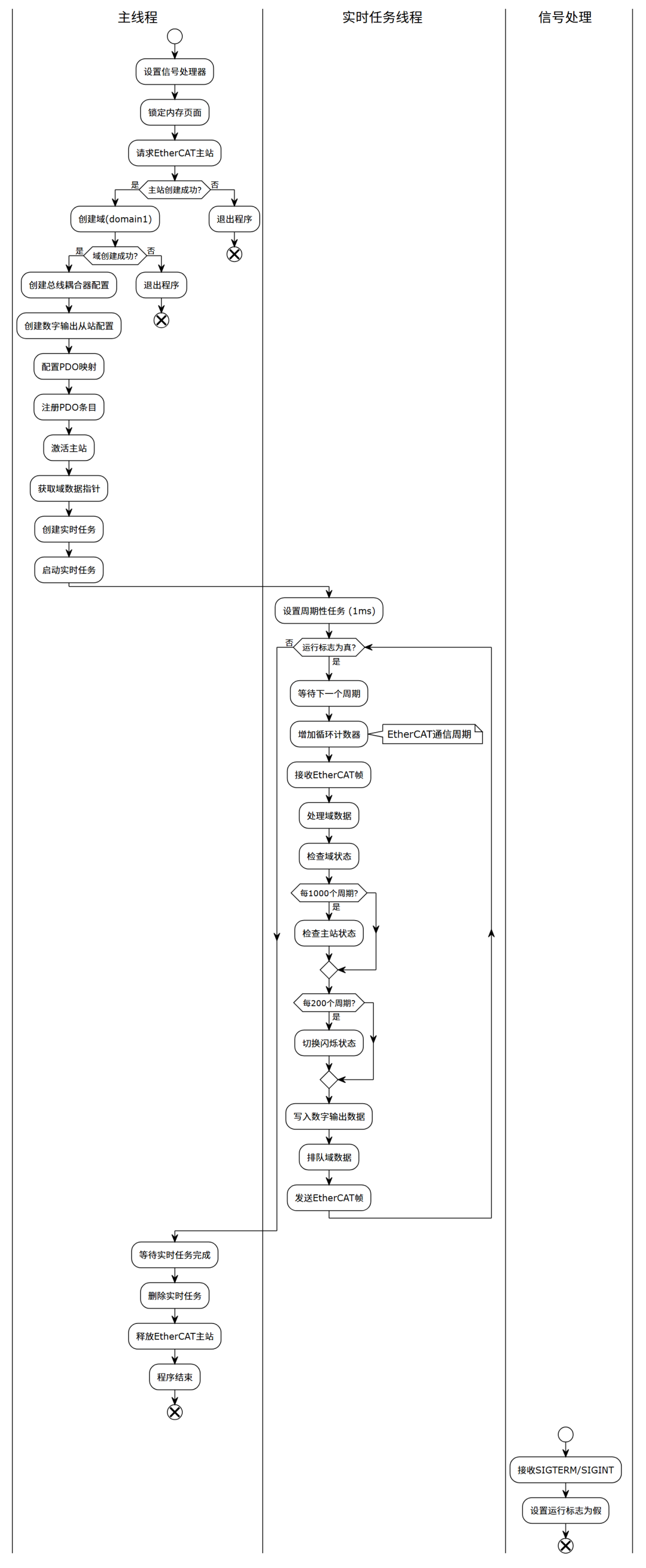 这是一个基于 IgH EtherCAT Master 和 Xenomai 实时扩展的 C 语言示例程序。其核心功能是建立一个简单的 EtherCAT 网络,并以硬实时的方式周期性地控制一个数字量输出模块。