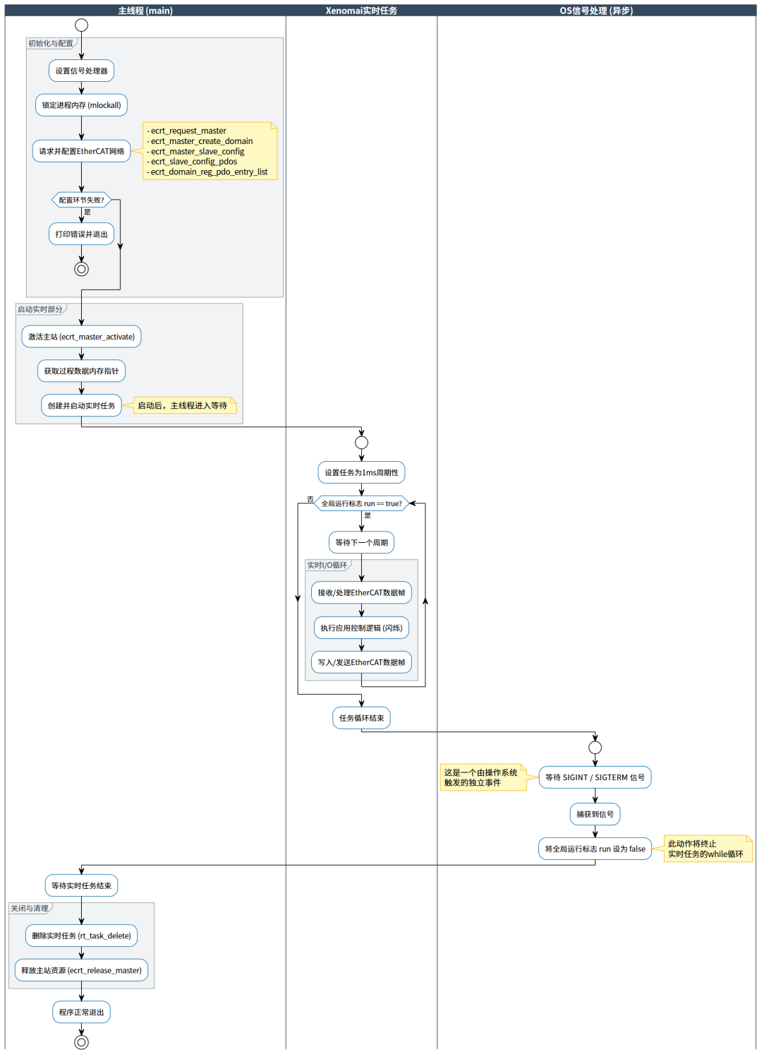 while循环和主函数的while循环都会因此而退出。程序随后执行清理工作:删除实时任务,释放 EtherCAT 主站资源,然后正常退出。