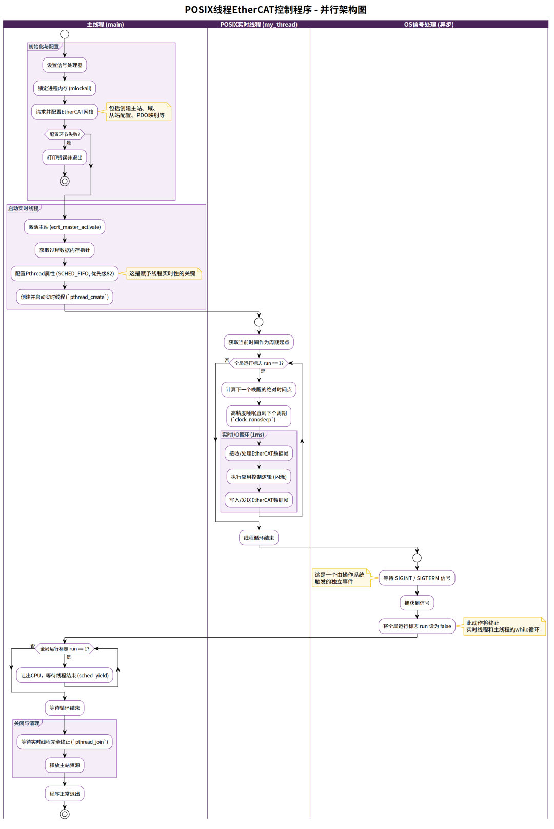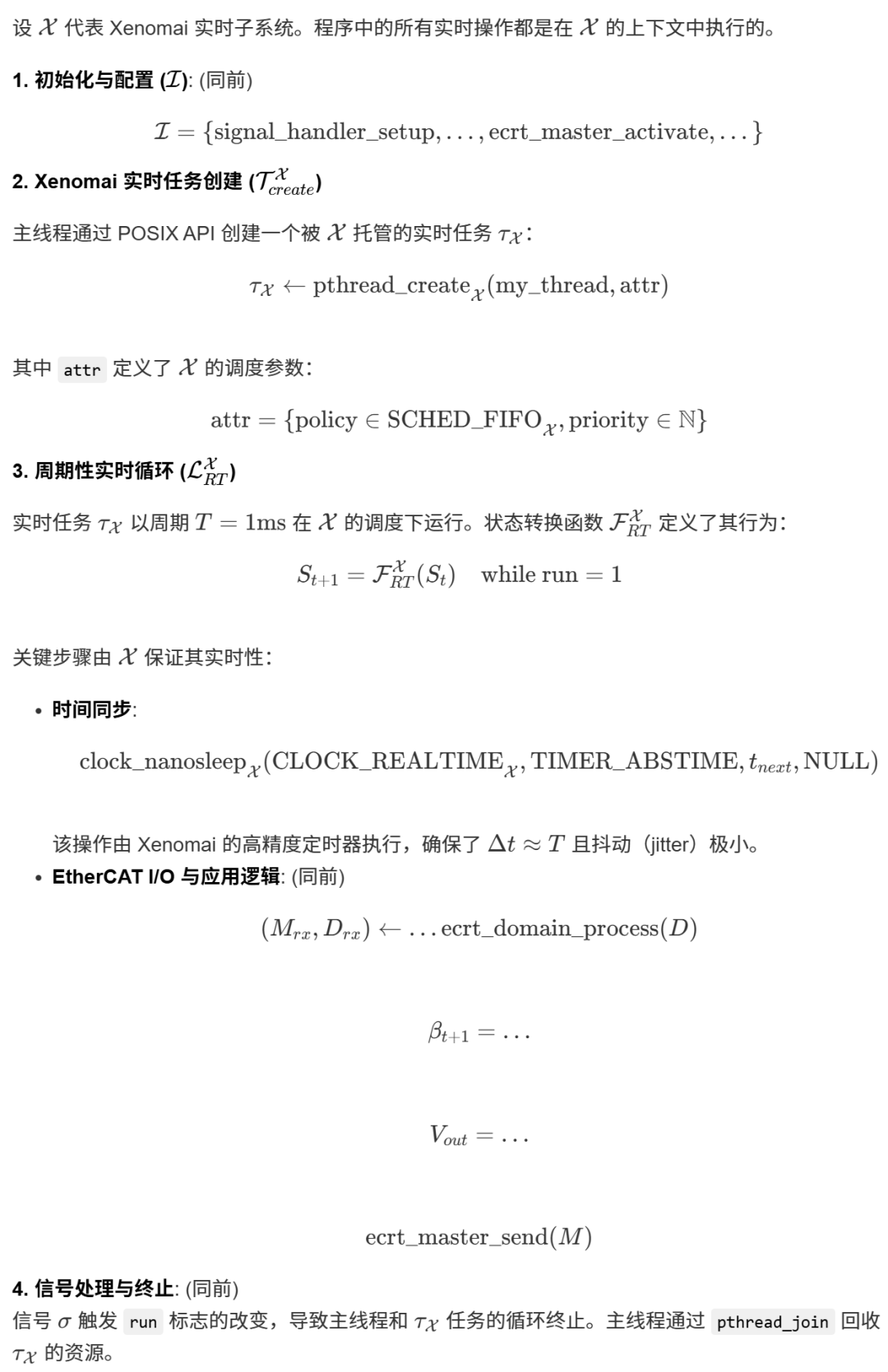 main函数执行标准的 EtherCAT 初始化流程,包括请求主站、创建域、配置从站和 PDO、激活主站等。这些步骤与非 Xenomai 环境下的 IgH 应用完全相同。同时,它也设置了信号处理和内存锁定。创建 Xenomai 实时任务 (通过 POSIX API):