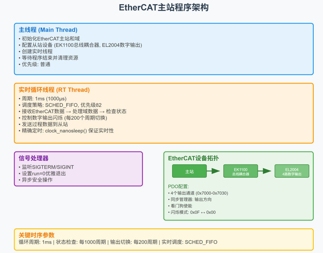 clock_nanosleep函数保证。同样,这个 POSIX API 调用被 Xenomai 拦截,并由 Xenomai 的高精度、无抖动的定时器服务来执行,从而实现了微秒级的确定性定时。在每个精确的周期内,任务执行标准的 EtherCAT I/O 流程:接收、处理、执行应用逻辑(闪烁控制)、发送。