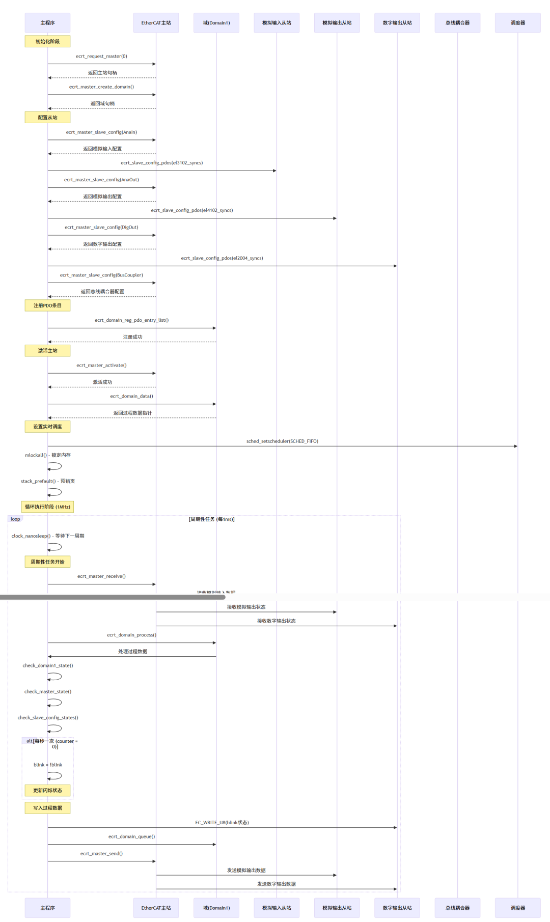 序列图展示了EtherCAT程序的执行流程,包括: