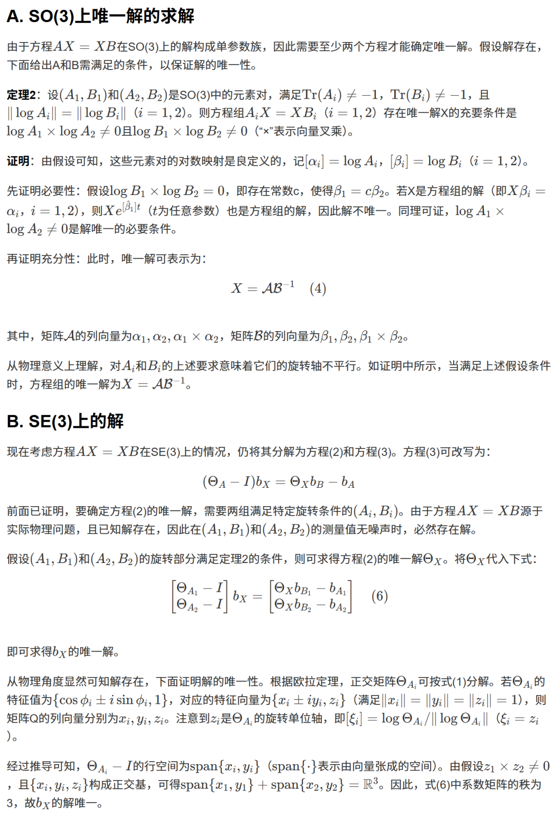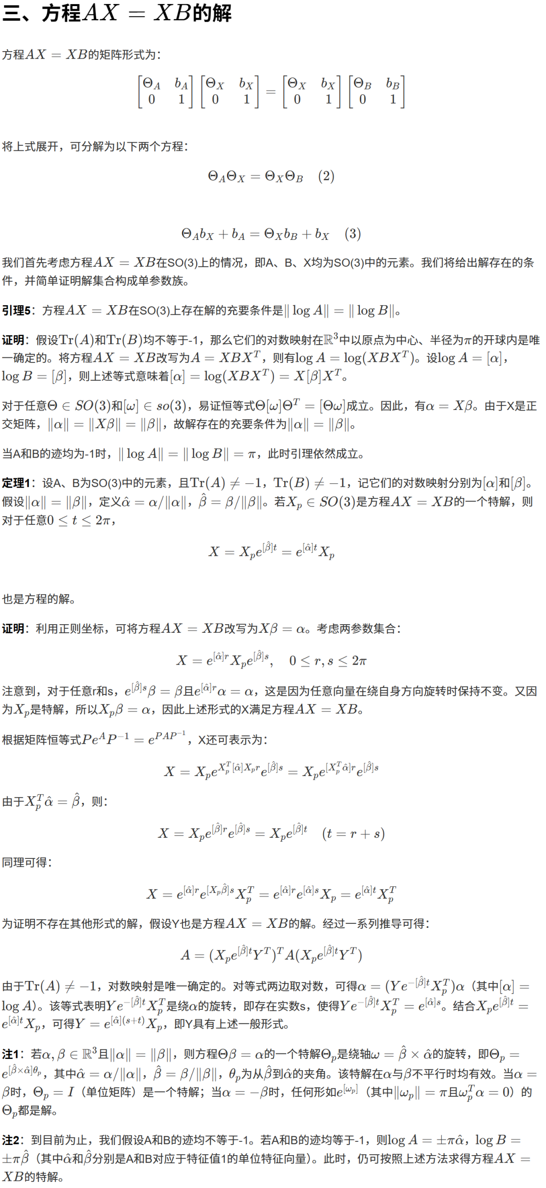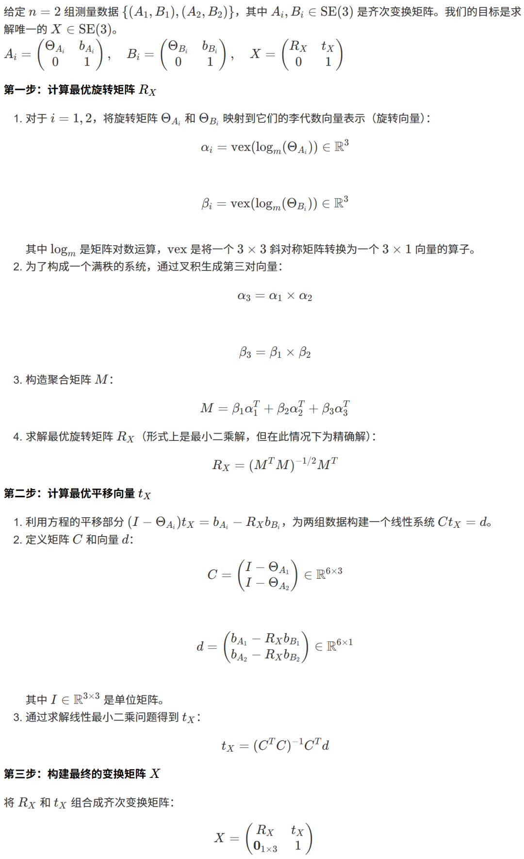 for i in range(1): # 开始一个循环,但范围是range(1),意味着这个循环只会执行一次(i=0)。 alpha = logR(A[i]) # 计算第一个A矩阵(A1)的旋转向量 alpha。 beta = logR(B[i]) # 计算第一个B矩阵(B1)的旋转向量 beta。 alpha2 = logR(A[i+1]) # 计算第二个A矩阵(A2)的旋转向量 alpha2。 beta2 = logR(B[i+1]) # 计算第二个B矩阵(B2)的旋转向量 beta2。 alpha3 = numpy.cross(alpha, alpha2) # 计算 alpha 和 alpha2 的叉积,生成一个线性无关的向量 alpha3。 beta3 = numpy.cross(beta, beta2) # 计算 beta 和 beta2 的叉积,生成对应的向量 beta3。