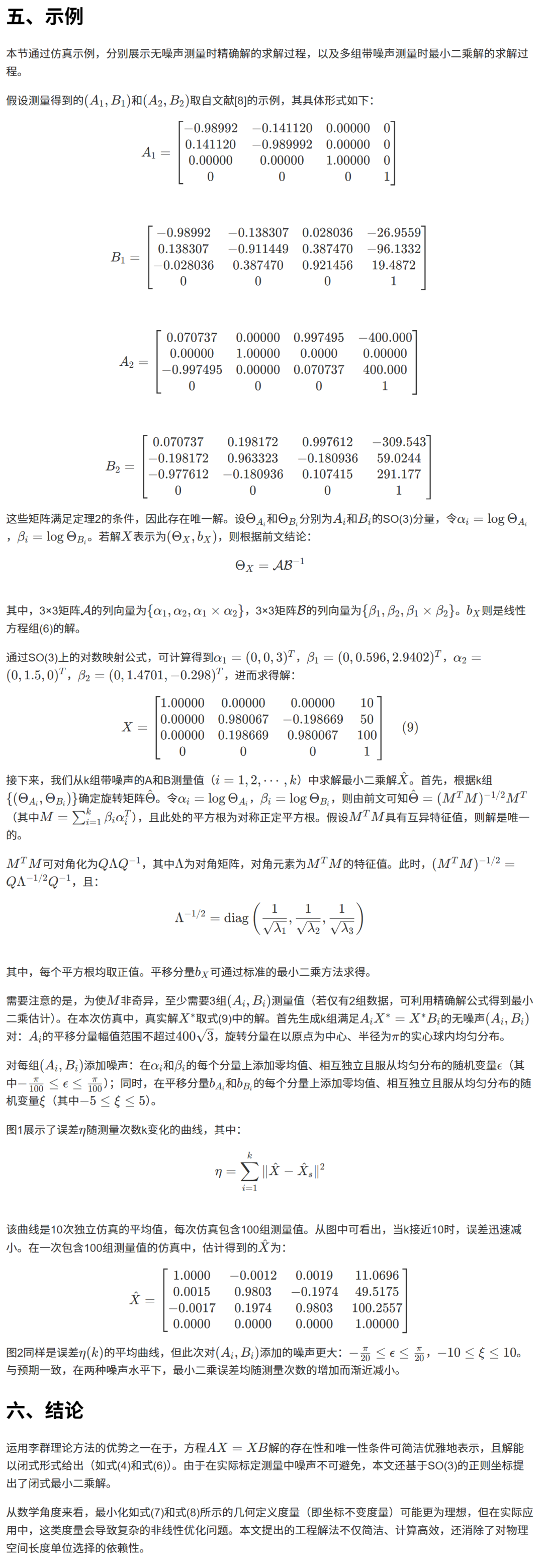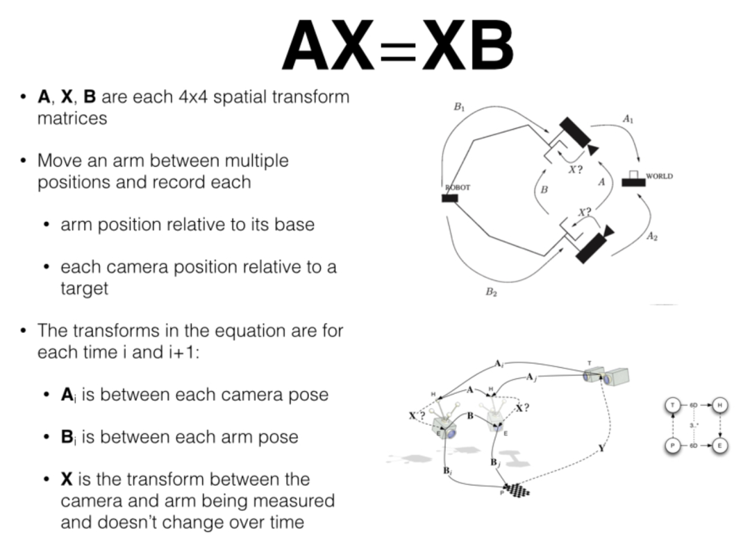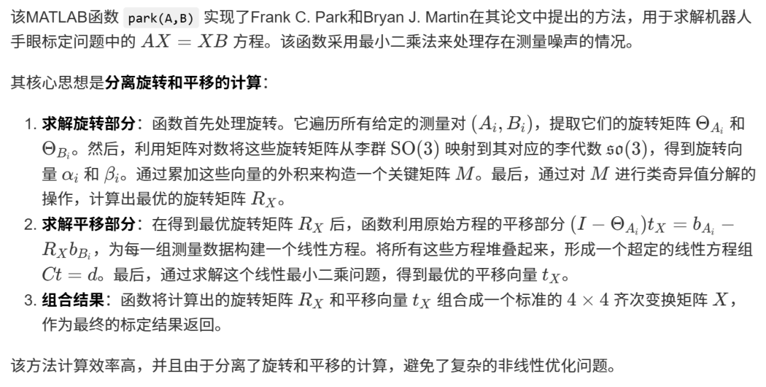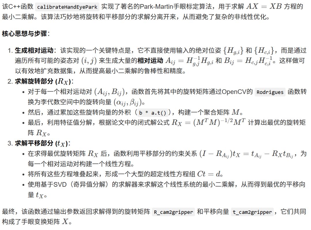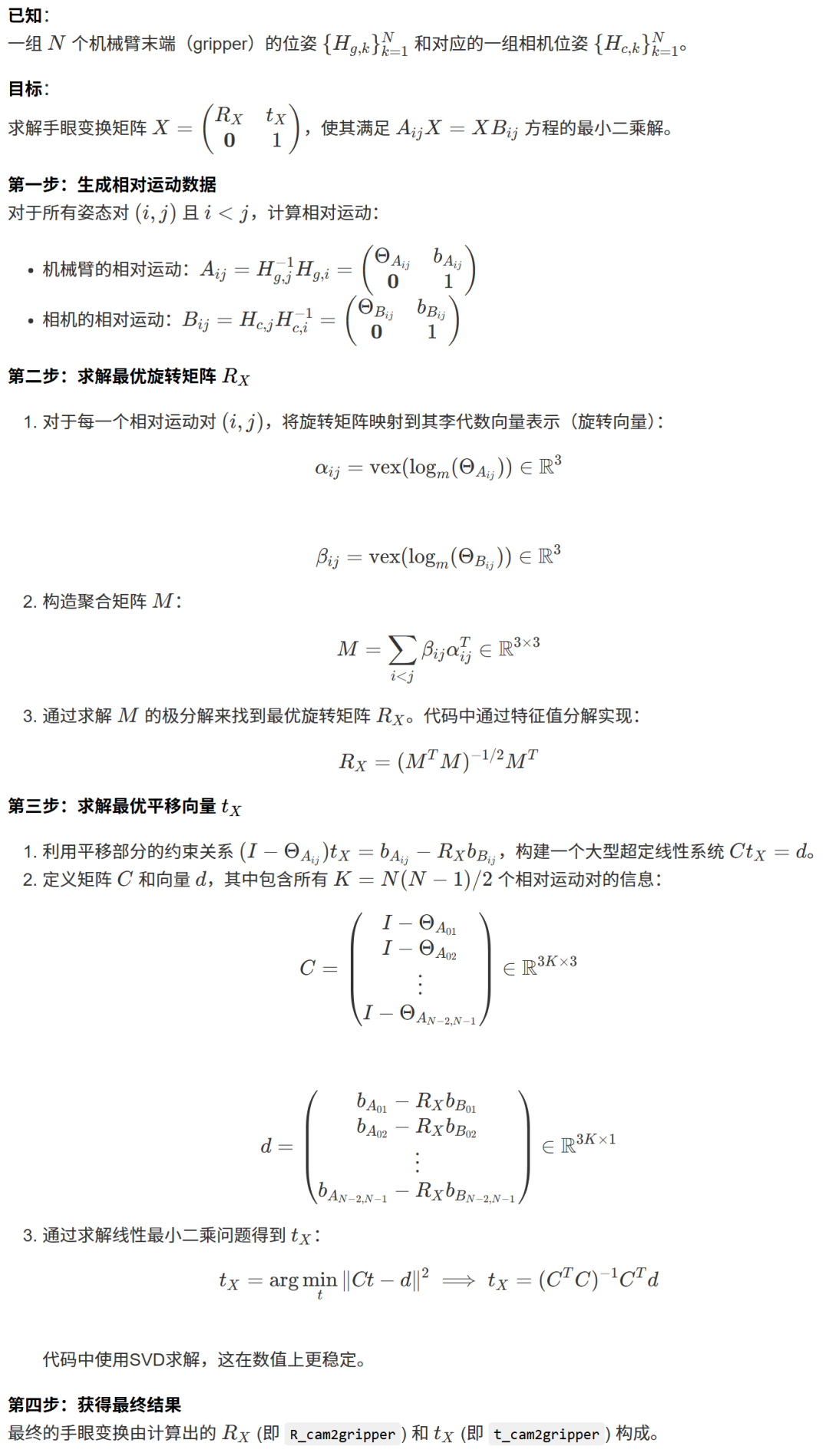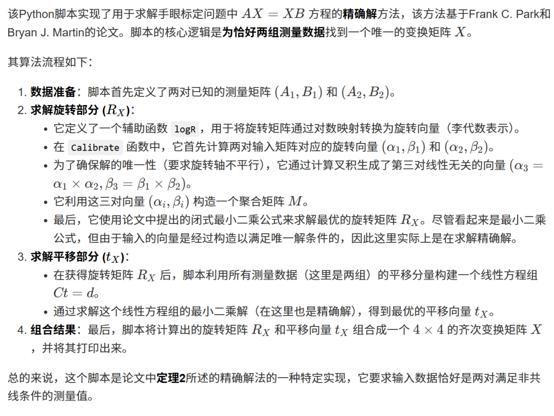b_x = numpy.dot(inv(numpy.dot(C.T, C)), numpy.dot(C.T, d)) # 使用正规方程法求解线性最小二乘问题 Ct=d,得到最优平移向量 b_x。 return theta, b_x # 返回计算出的最优旋转矩阵 theta 和平移向量 b_x。X = numpy.eye(4) # 初始化最终结果X为一个4x4的单位矩阵。A = [A1, A2] # 将输入的A矩阵放入一个列表中。B = [B1, B2] # 将输入的B矩阵放入一个列表中。theta, b_x = Calibrate(A, B) # 调用 Calibrate 函数,传入数据并获取计算结果。X[0:3, 0:3] = theta # 将计算出的旋转矩阵 theta 填充到 X 的左上角3x3部分。X[0:3, -1] = b_x.flatten() # 将计算出的平移向量 b_x 展平并填充到 X 的最后一列的前三行。print("X: ") # 打印一个标签 "X: "。print(X) # 打印最终计算出的手眼标定矩阵 X。