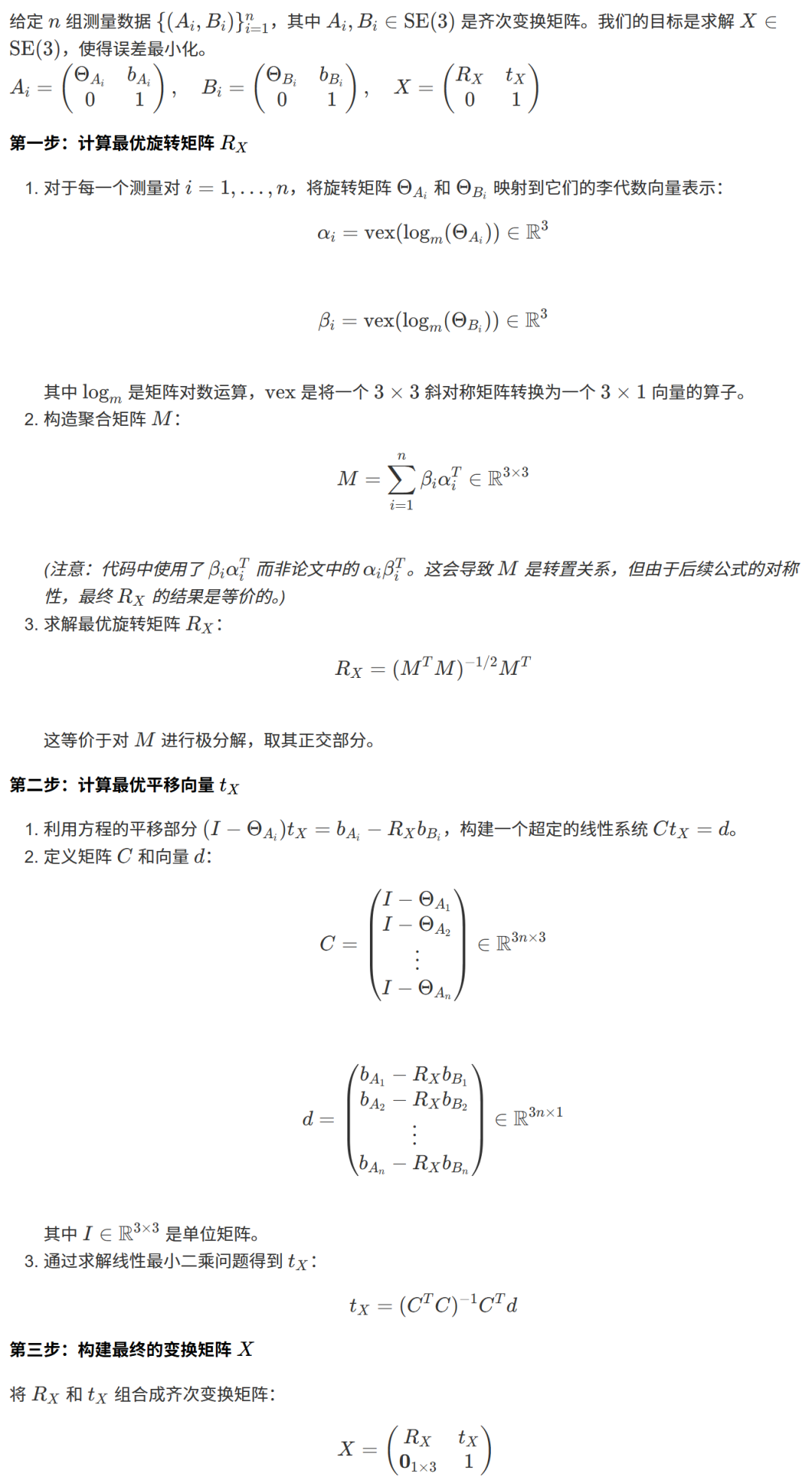 C[3*i:3*i+3, :] = numpy.eye(3) - rot_a # 填充矩阵 C 的第 i 个块,等于 I - Θ_Ai。 d[3*i:3*i+3, 0] = trans_a - numpy.dot(theta, trans_b) # 填充向量 d 的第 i 个块,等于 b_Ai - R_X * b_Bi。