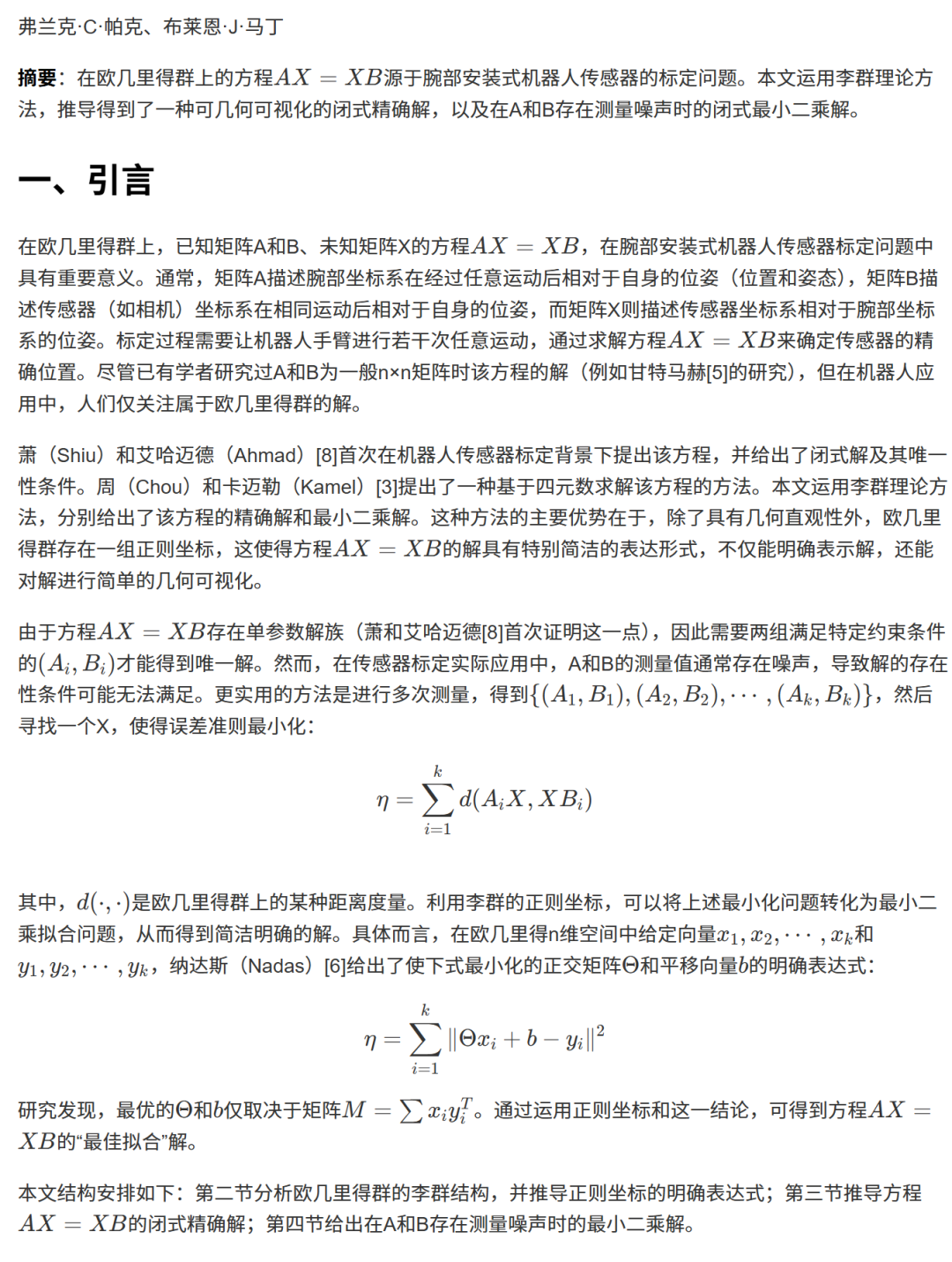 from scipy.linalg import sqrtm # 从 scipy.linalg 库中导入 sqrtm 函数,用于计算矩阵的平方根。from numpy.linalg import inv # 从 numpy.linalg 库中导入 inv 函数,用于计算矩阵的逆。import numpy # 导入 numpy 库,用于进行科学计算,特别是多维数组操作。from numpy import dot, eye, zeros, outer # 从 numpy 库中导入常用的函数:dot(点积), eye(单位矩阵), zeros(零矩阵), outer(外积)。from numpy.linalg import inv # 再次从 numpy.linalg 库中导入 inv 函数(重复导入,但不影响功能)。# 定义第一个测量对中的矩阵 A1A1 = numpy.array([[-0.989992, -0.14112, 0.000, 0], # 矩阵的第一行 [0.141120 , -0.989992, 0.000, 0], # 矩阵的第二行 [0.000000 , 0.00000, 1.000, 0], # 矩阵的第三行 [0 , 0, 0, 1]]) # 矩阵的第四行(齐次坐标)# 定义第一个测量对中的矩阵 B1B1 = numpy.array([[-0.989992, -0.138307, 0.028036, -26.9559], # 矩阵的第一行 [0.138307 , -0.911449, 0.387470, -96.1332], # 矩阵的第二行 [-0.028036 , 0.387470, 0.921456, 19.4872], # 矩阵的第三行 [0 , 0, 0, 1]]) # 矩阵的第四行(齐次坐标)# 定义第二个测量对中的矩阵 A2A2 = numpy.array([[0.07073, 0.000000, 0.997495, -400.000], # 矩阵的第一行 [0.000000, 1.000000, 0.000000, 0.000000], # 矩阵的第二行 [-0.997495, 0.000000, 0.070737, 400.000], # 矩阵的第三行 [0, 0, 0,1]]) # 矩阵的第四行(齐次坐标)# 定义第二个测量对中的矩阵 B2B2 = numpy.array([[ 0.070737, 0.198172, 0.997612, -309.543], # 矩阵的第一行 [-0.198172, 0.963323, -0.180936, 59.0244], # 矩阵的第二行 [-0.977612, -0.180936, 0.107415, 291.177], # 矩阵的第三行 [0, 0, 0, 1]]) # 矩阵的第四行(齐次坐标)def logR(T): # 定义一个函数 logR,用于计算旋转矩阵的对数映射,即将其转换为旋转向量。 R = T[0:3, 0:3] # 从输入的4x4齐次变换矩阵 T 中提取出3x3的旋转矩阵 R。 theta = numpy.arccos((numpy.trace(R) - 1)/2) # 根据公式计算旋转角度 theta。 logr = numpy.array([R[2,1] - R[1,2], R[0,2] - R[2,0], R[1,0] - R[0,1]]) * theta / (2*numpy.sin(theta)) # 根据罗德里格斯反变换公式,从R和theta计算出旋转向量(轴角表示)。 return logr # 返回计算得到的3x1旋转向量。def Calibrate(A, B): # 定义主标定函数 Calibrate,输入参数为A矩阵列表和B矩阵列表。 n_data = len(A) # 获取测量数据对的数量。 M = numpy.zeros((3,3)) # 初始化一个3x3的零矩阵 M,用于后续计算旋转部分。 C = numpy.zeros((3*n_data, 3)) # 初始化一个(3*n)x3的零矩阵 C,用于构建求解平移的线性方程组。 d = numpy.zeros((3*n_data, 1)) # 初始化一个(3*n)x1的零向量 d,用于构建求解平移的线性方程组。 A_ = numpy.array([]) # 初始化一个空数组 A_(此行代码在后续未使用)。