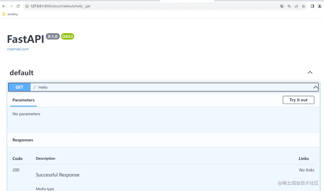 不难看出,用 FastAPI 启动的 Web 服务器,代码更为简洁。同时,FastAPI 还可以自动根据接口参数自动生成Swagger文档,只需访问 127.0.0.1:8000/docs: