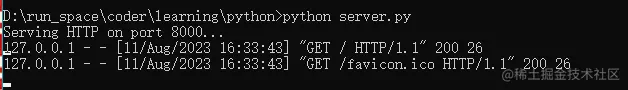 当命令行打印 Serving HTTP on port 8000... 就代表服务启动成功了,如果启动失败,我们需要检查一下 8000 端口是否被其他程序占用,或者在 server.py 里面换一个端口再启动。