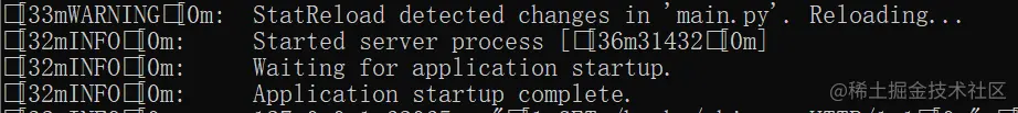 我们将以上内容保存在 main.py 文件中时,由于之前启动加了 --reload 参数,服务会重新启动: