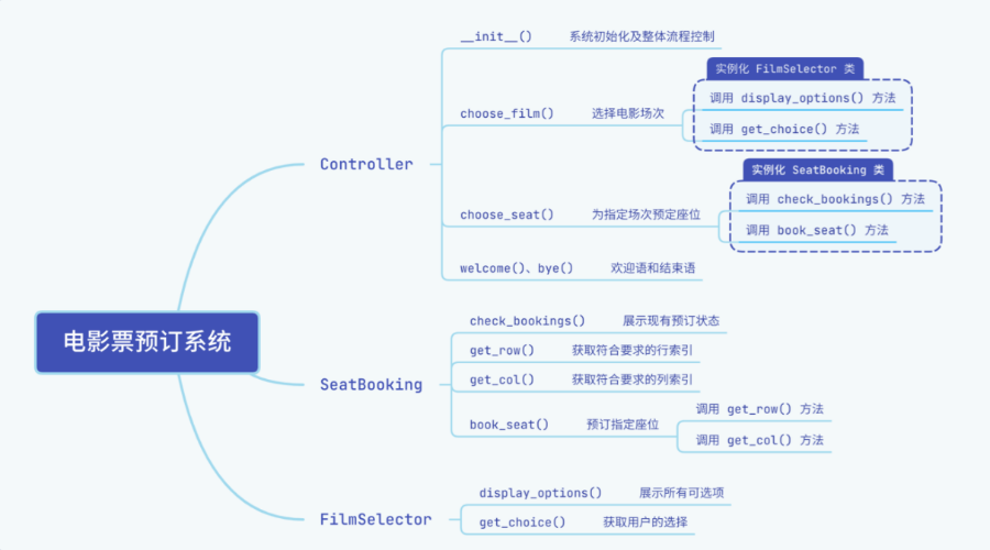 可以把选座系统抽象成一个类:SeatBooking,这个类包含了两种方法,check_bookings() 用于展示所有座位的预订状态,book_seat() 用于完成预订。