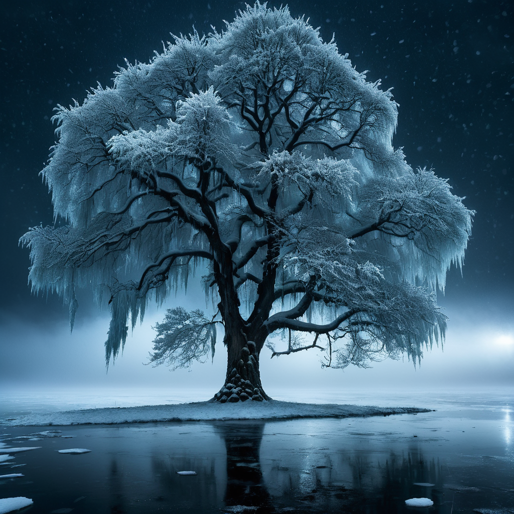frozen tree, frozen lake, trees, mist, extreme detail, high quality, dark, scifi, cinematic feel, dark contrast, night scene, snow, ice, dark skies, cloud, strong backlight, viginette, icicles