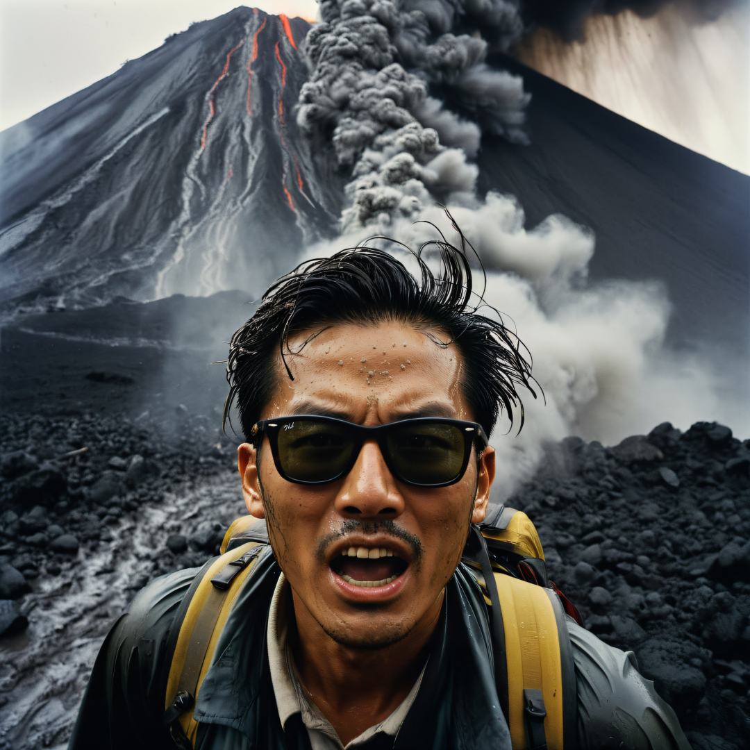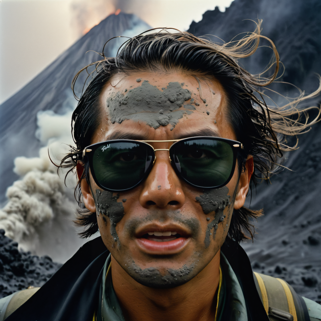 masterwork photograph, terrified close-up view, long exposure, short lighting, Hasselblad, wearing dirt thick black frame rayban dirty hair and face covered by grey mud rain crying Chinese male mountain hiker , volcanic ash smoke rain from the volcano, Fujicolor Superia X-TRA 400, spotlight, L USM