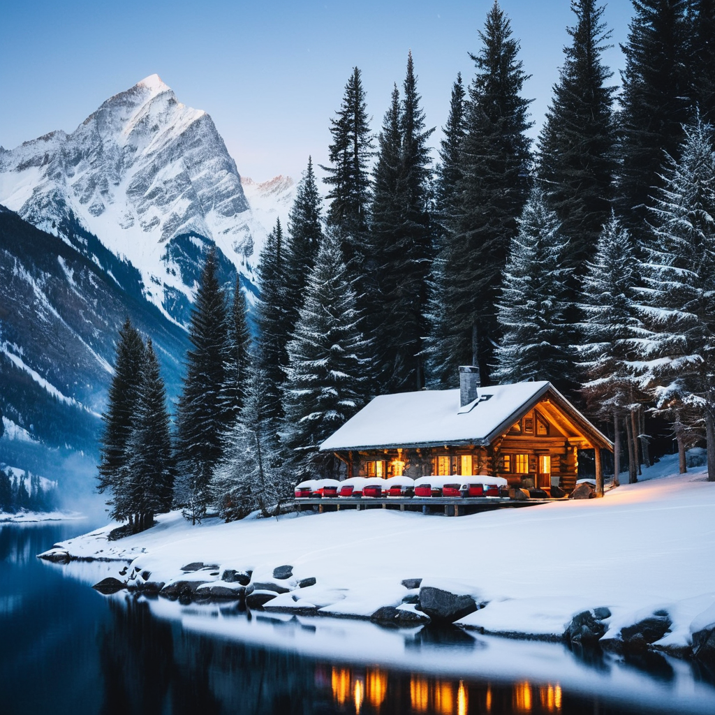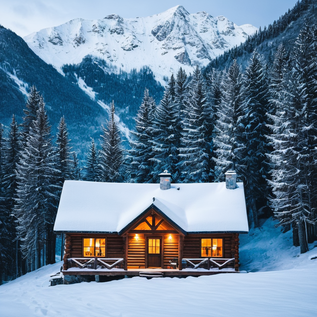 Photograph a cozy cabin nestled in a snowy mountain setting,evoking a sense of warmth and contrast to the cold surroundings,