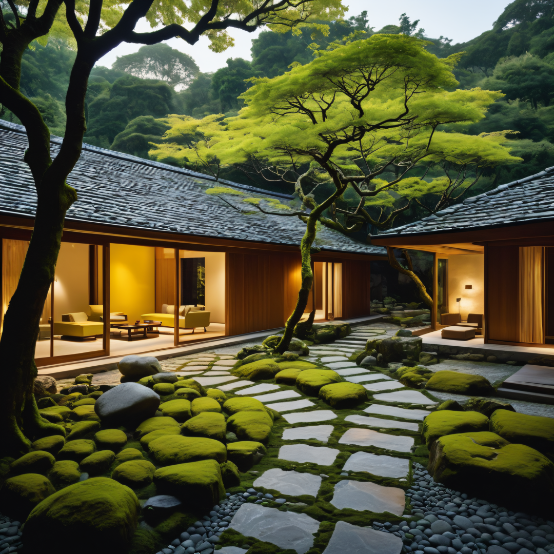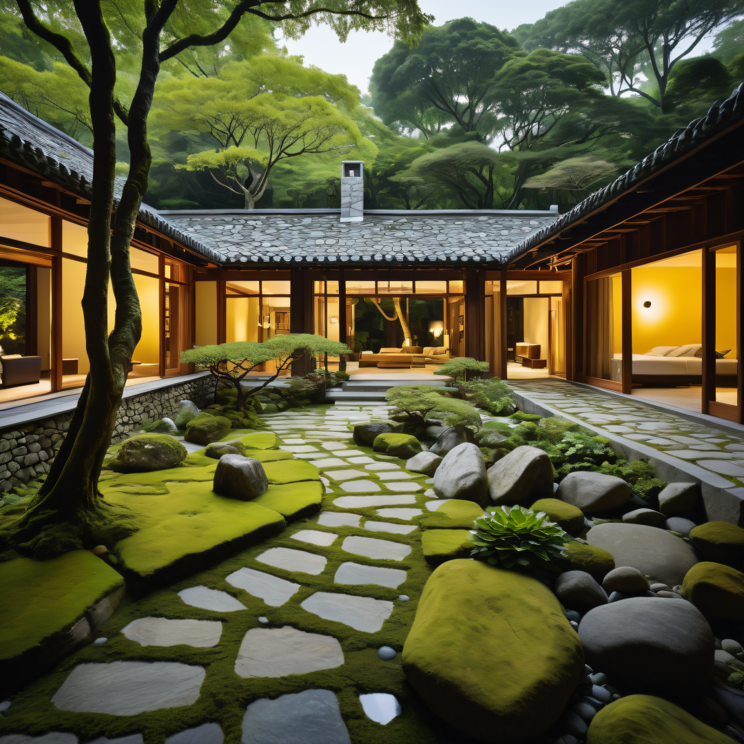 Inside the courtyard, the house and the courtyard are linked together, Slender trees form dense forests, A patchwork of miscellaneous wood combinations, A space full of Zen, The island's stone-paved creek, Flowing throughout the yard, Moss covered with stones, The dim yellow light of the small stone lamp fell on the plants, chiaroscuro, cinematic lighting, Sony FE GM, Wide-Angle, perspective, from outside,