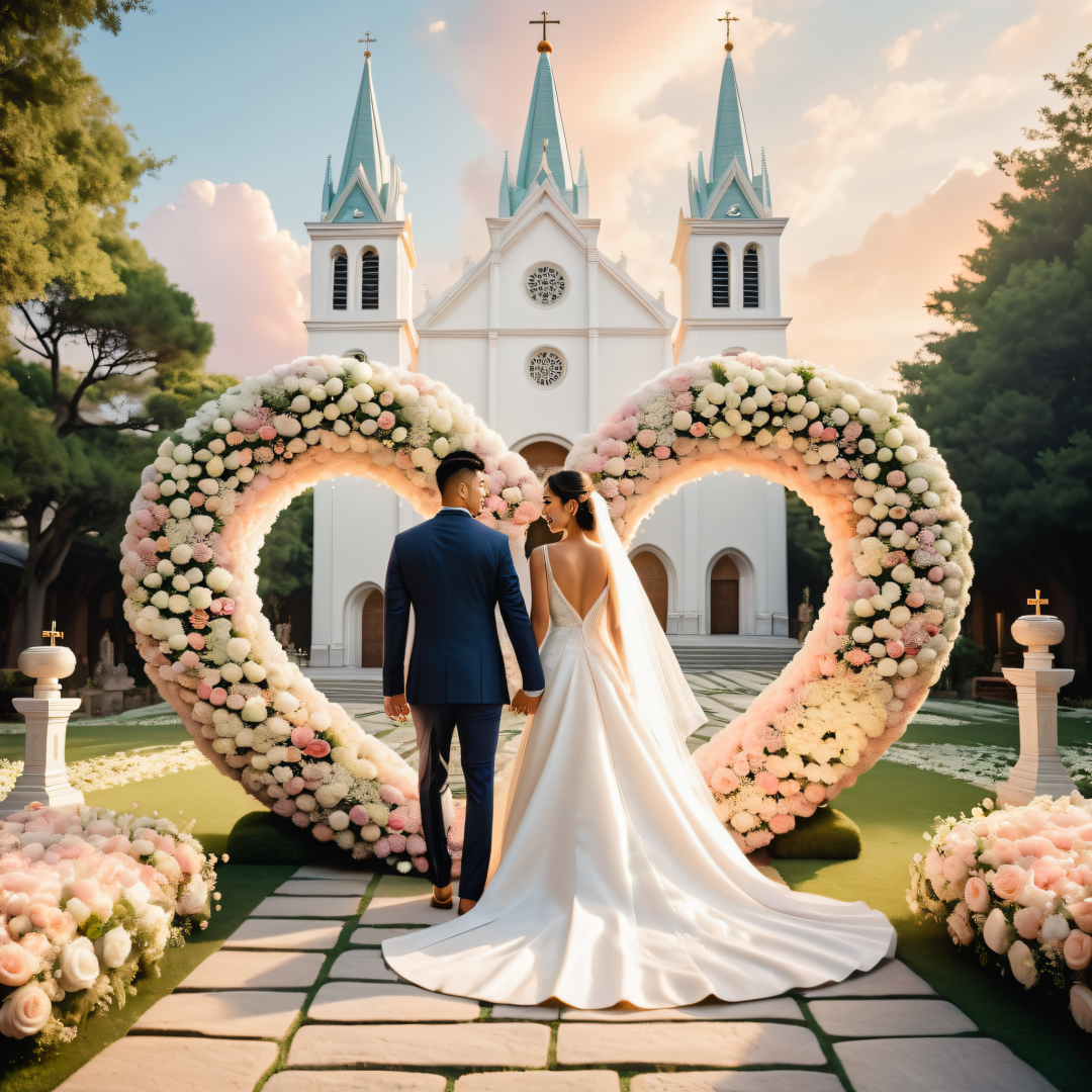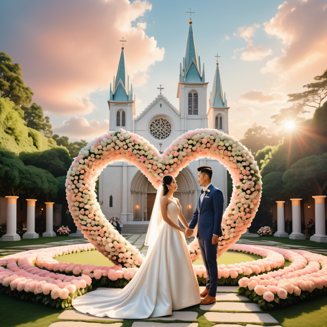 masterpiece, (best quality), highly detailed, ultra realistic, a wedding ceremony on a manicured lawn, a Chinese bride and Chinese groom holding hands before a giant heart sculpture made of flowers and plants, intricate floral details, stone path beneath their feet, a European-style cathedral in the background, painted sky at dusk with soft pastel hues, radiant light illuminating the couple and church façade, cinematic atmosphere, extremely sharp focus, exceptionally clear details on the bride's gown, groom's suit, floral arrangement, and church architecture, photorealistic textures and lighting, depth of field with dreamy background blur, conveying joy and love, worthy of fine art photography.