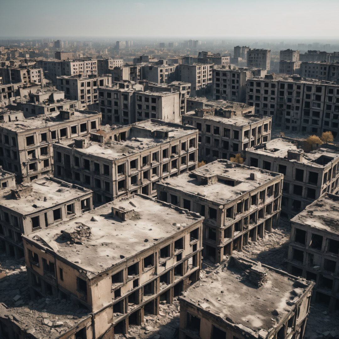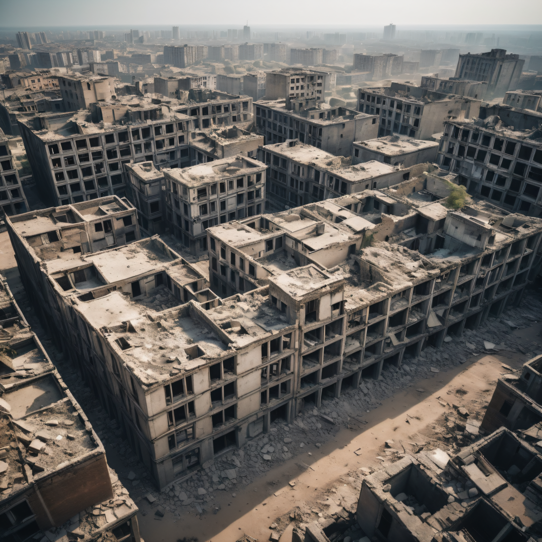 apocalyptic photograph of an abandoned city, crumbling buildings, view from above, dusty atmosphere, depth of field, low color usage, less contrast, extreme detail, natural grain effect, 8k quality image, high resolution, ultra realism