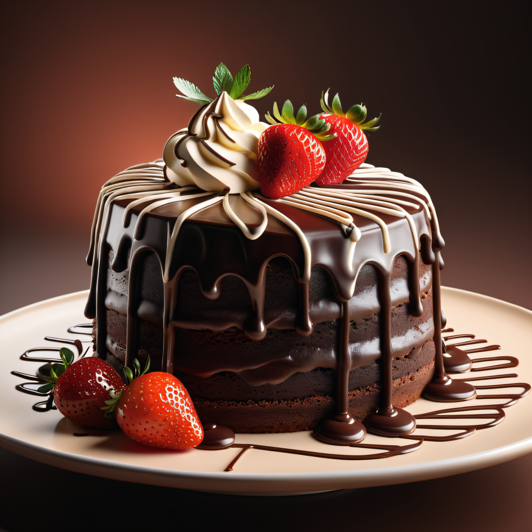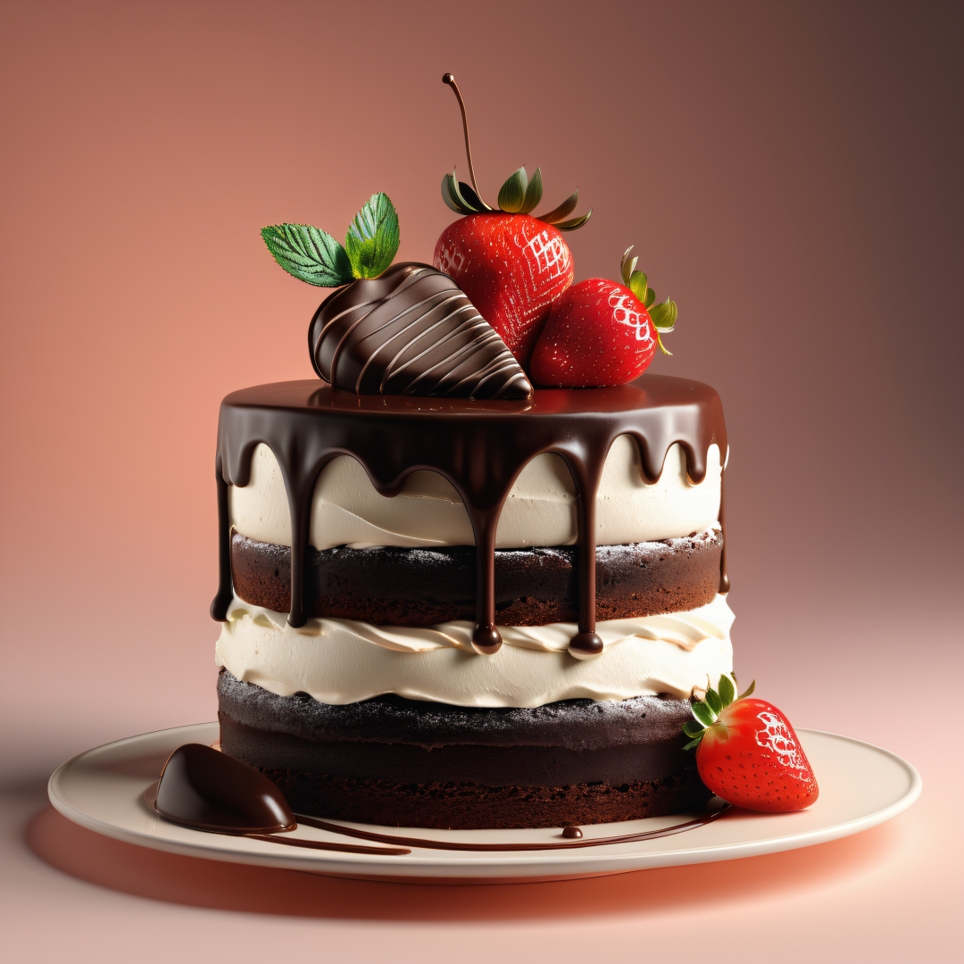 professional 3d model a photo of a cream chocolate cake,with chocolate topping and cream and a single strawberry,warm side light from the left, octane render, highly detailed, volumetric, dramatic lighting