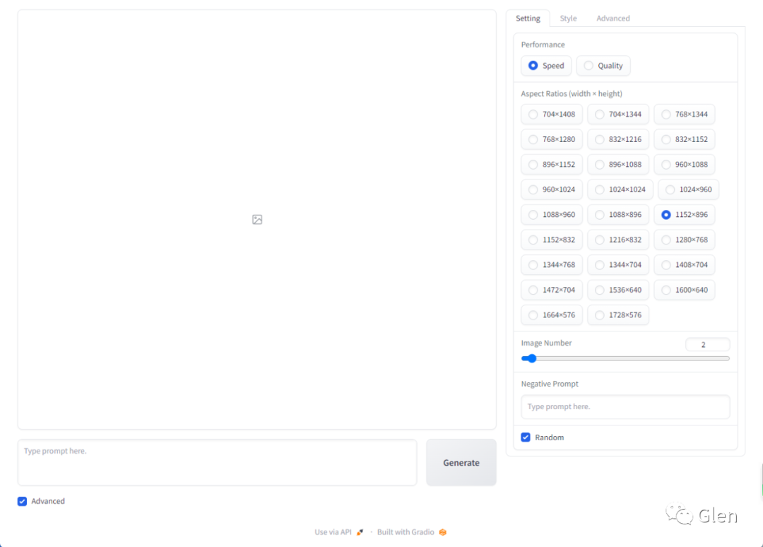 下载完成后,就会自动打开绘图界面了。默认模式是简洁模式,只有一个输入框、生成图片区域和生成按钮。