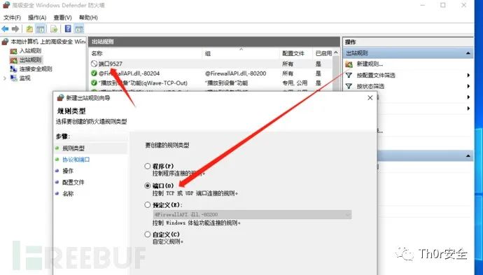 2.因为使用的是reverse监听器方式,所以是出站,使用的是9527端口。在win10虚拟机配置出站规则