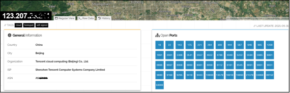 随便点击一个IP地址进入链接页面,即可看到关于这个IP地址的详细信息,右侧展示的为对外开放的全部端口号,如图所示。