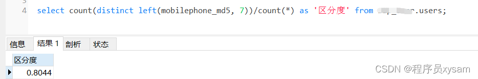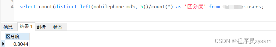 我是建议他使用select count(distinct left(mobile_md5, 5))/count(*) from XXX.users查找最大的区分度: