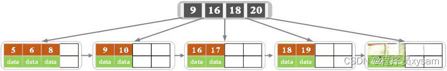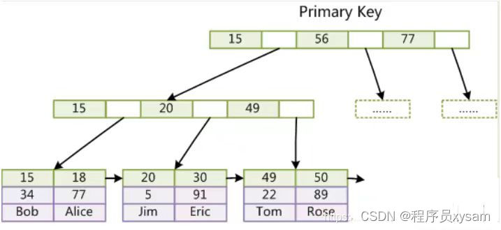 而B+树是多叉树,一个数据页的大小是16kb,在1-3的树高就能存储10亿级以上的数据,也就是只要访问磁盘1-3次就足够了,并且B+树的叶子结点上一个叶子结点有指针指向下一个叶子结点,便于范围查询:
