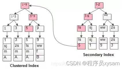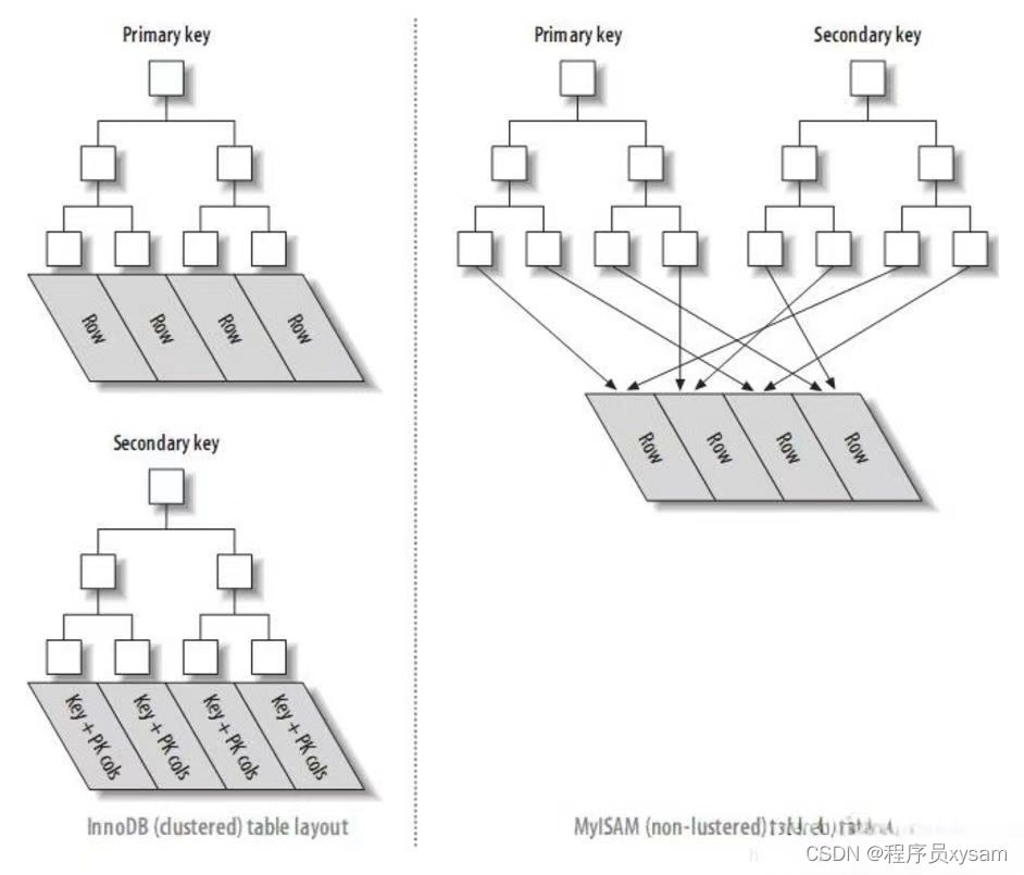 InnoDB的主键索引中叶子结点并不是存储行指针,而是存储行数据,二级索引中MyISAM也是一样的存储方式,InnoDB的二级索引的叶子结点则是存储当前索引值以及对应的主键索引值。