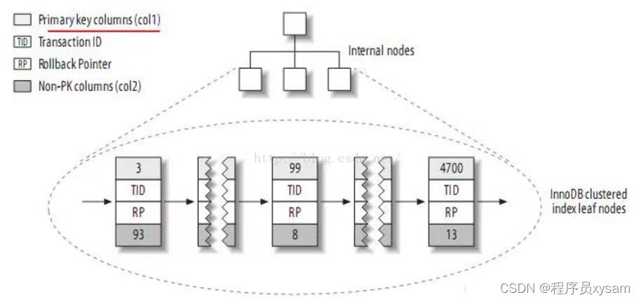 再详细了解什么事回表之前,我们先来详细的深入了解一下什么是InnoDB的索引存储形式,InnoDB的主键索引存储形式是聚族索引,索引与数据都在一起: