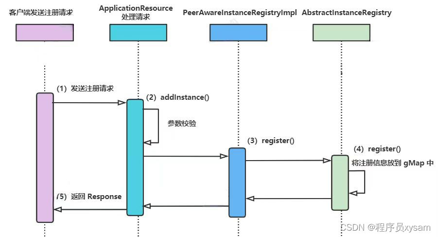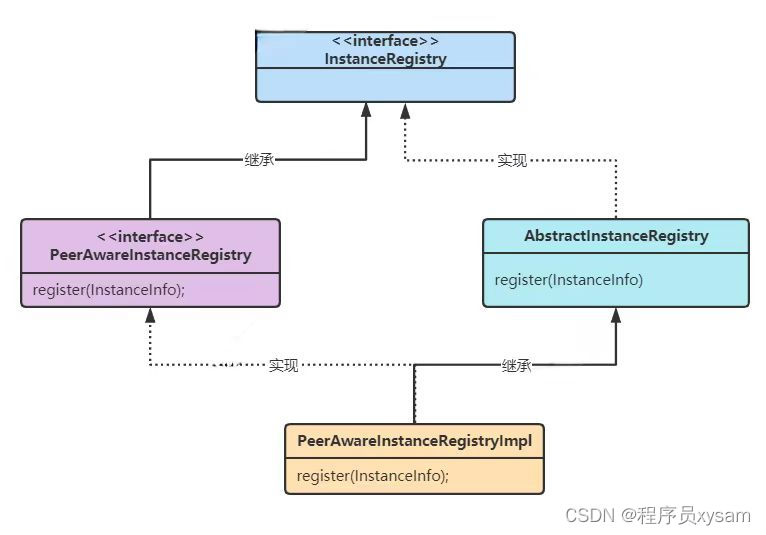 调用它的 register() 方法后会调用抽象类 AbstractInstanceRegistry 的 register() 方法,核心代码就是在这个抽象类的 register() 方法。另外要说下的就是上面的抽象类和接口分别实现和继承了接口 InstanceRegistry。