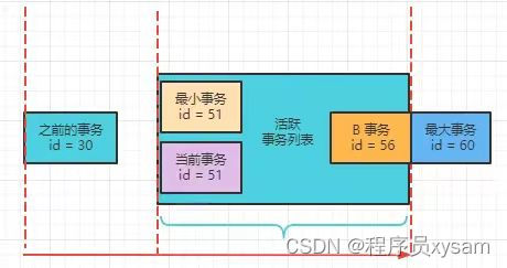 事务 B 的 事务 id 59 不在活跃事务列表啦!但是又是小于最大事务 id 60 的。这就符合 3.2 的情况啦,可以读到这个版本了。