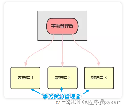 事务管理器负责协调多个数据库的事务,先问问各个数据库准备好了吗?如果准备好了,则在数据库执行操作,如果任一数据库没有准备,则回滚事务。