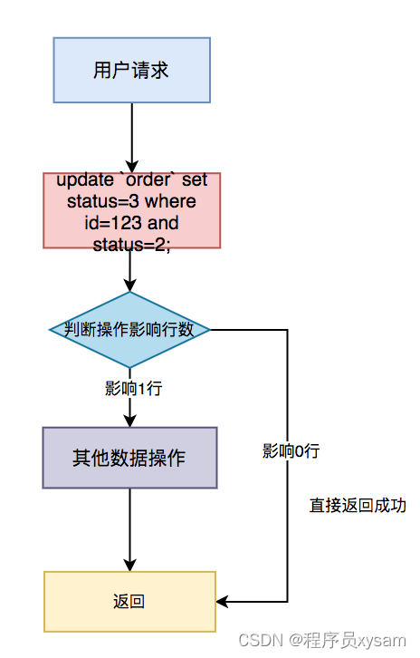 后面有相同的请求过来,再执行相同的sql时,由于订单状态变成了3,再用status=2作为条件,无法查询出需要更新的数据,所以最终sql执行结果的影响行数是0,即不会真正的更新数据。但为了保证接口幂等性,影响行数是0时,接口也可以直接返回成功。
