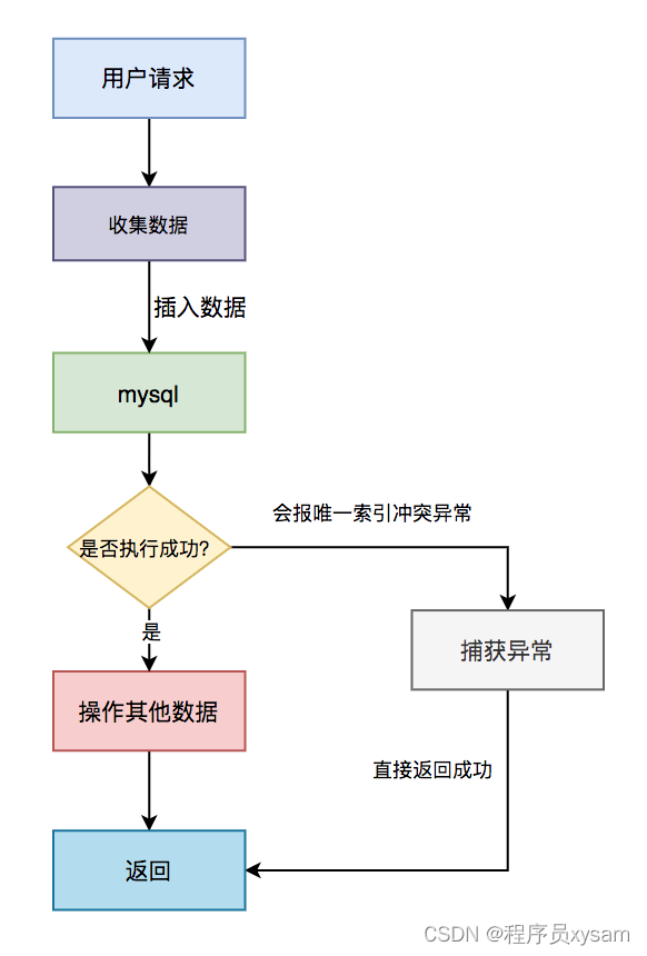 如果执行失败,捕获唯一索引冲突异常,直接返回成功。