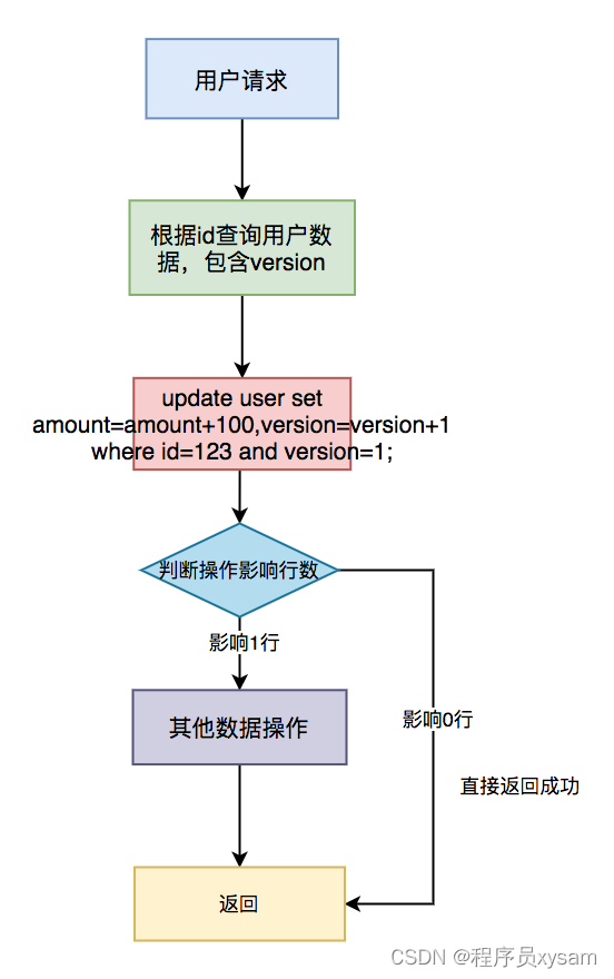 该update操作不会真正更新数据,最终sql的执行结果影响行数是0,因为version已经变成2了,where中的version=1肯定无法满足条件。但为了保证接口幂等性,接口可以直接返回成功,因为version值已经修改了,那么前面必定已经成功过一次,后面都是重复的请求。